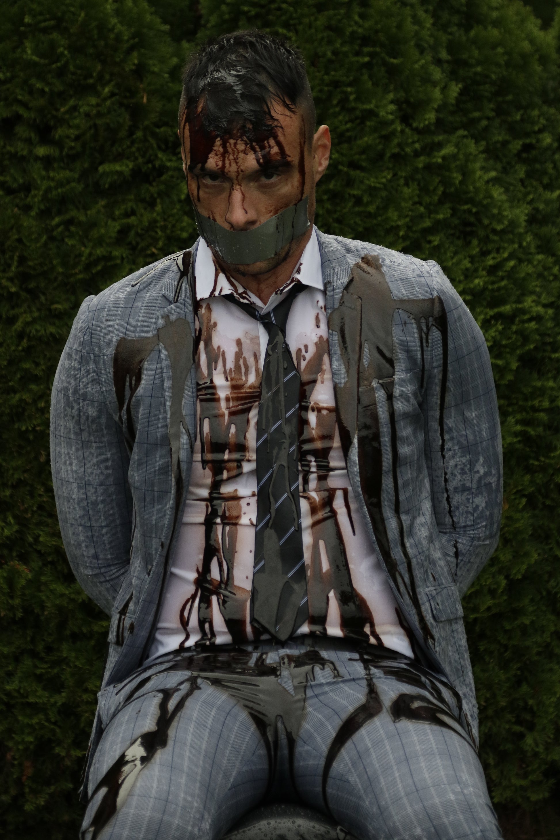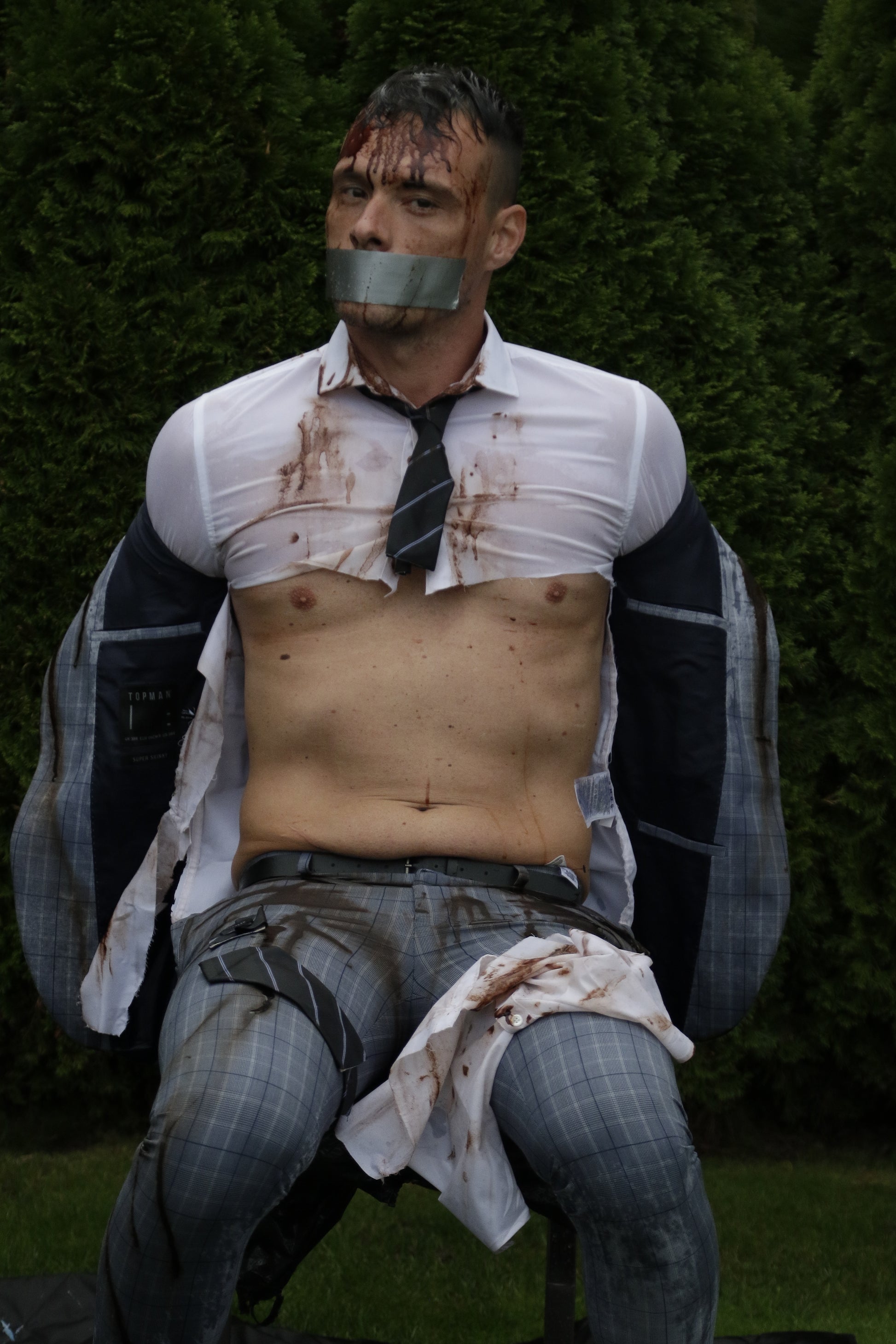 Damjan is dressed in a tight skinny checked suit, white shirt and striped tie. He gets tied and gagged to a chair before being soaked with buckets of water and a sprinkler.